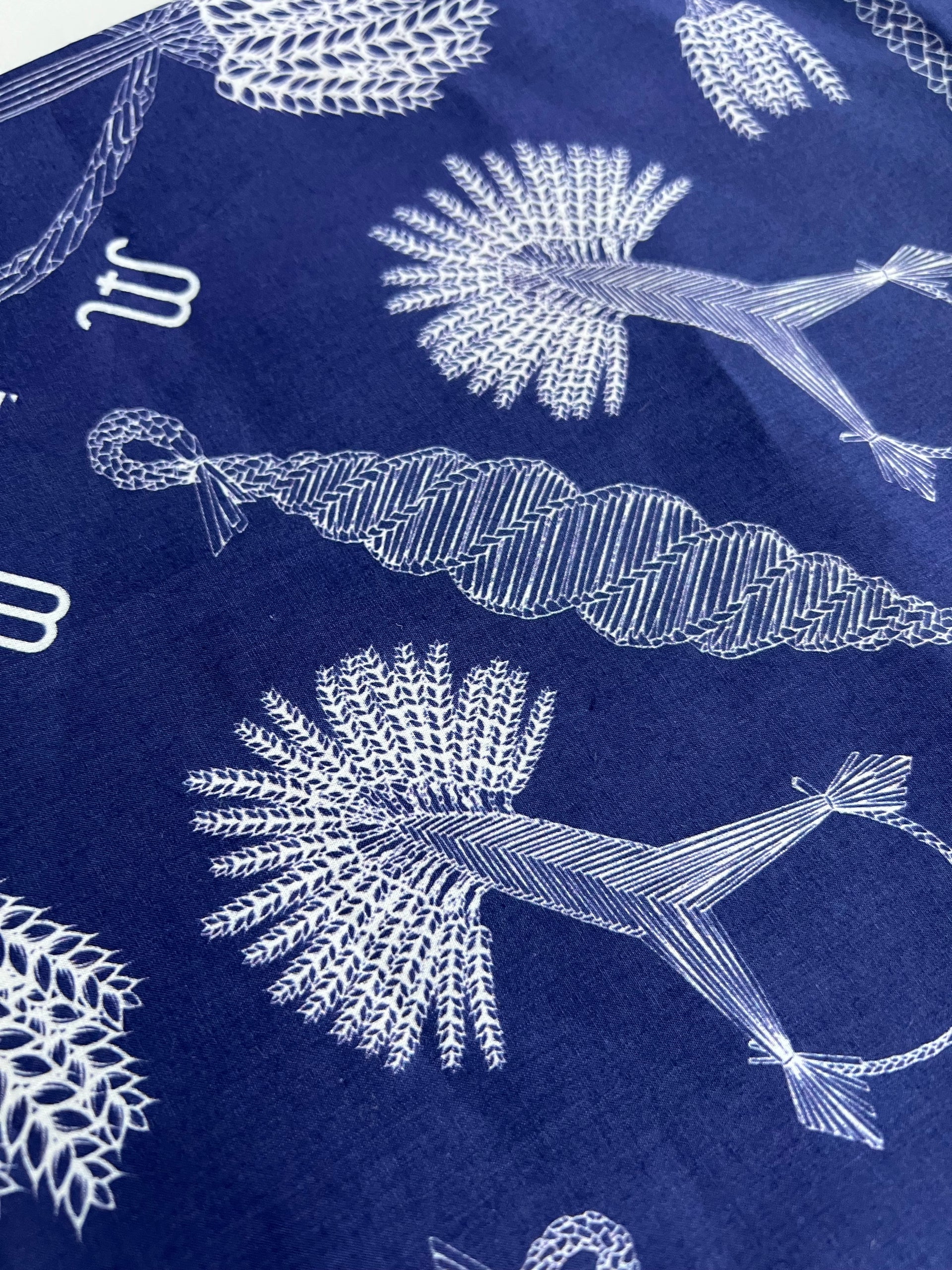 Single Mordiford Love Heart Corn Dolly Pattern Bandana in navy with white pattern, based on an original corn dolly by Penny Maltby. This classic bandana, for men and women, opens up a variety of styling possibilities. Depending on your mood, it can be worn as a scarf, as a cool headscarf or hair/headband, casually wrapped around the wrist or just put it in your pocket. It’s the perfect accessory and makes a great gift. Approx 55 x 55cm.