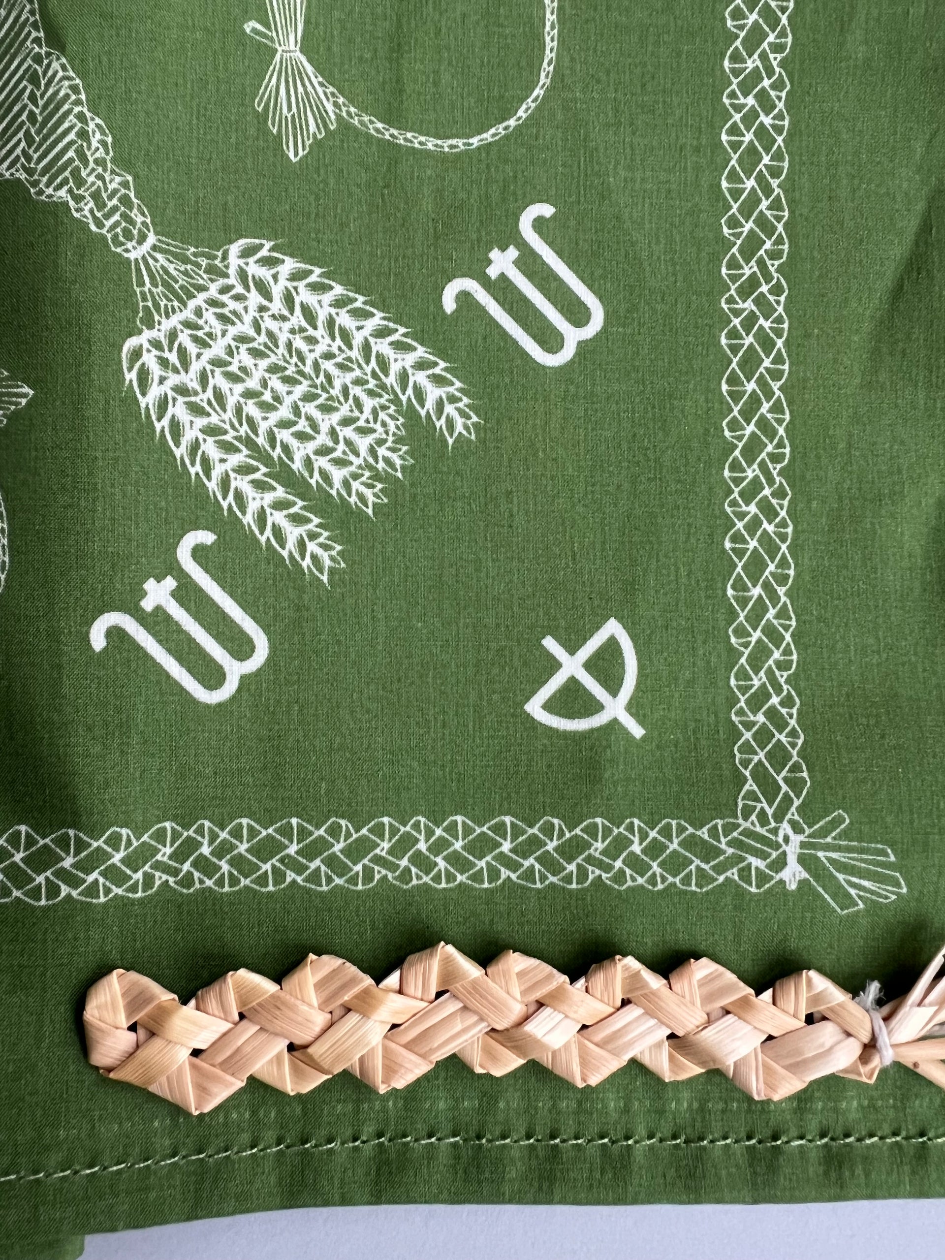Single Mordiford Love Heart Corn Dolly Pattern Bandana in olive green with white pattern, based on an original corn dolly by Penny Maltby. This classic bandana, for men and women, opens up a variety of styling possibilities. Depending on your mood, it can be worn as a scarf, as a cool headscarf or hair/headband, casually wrapped around the wrist or just put it in your pocket. It’s the perfect accessory and makes a great gift. Approx 55 x 55cm.